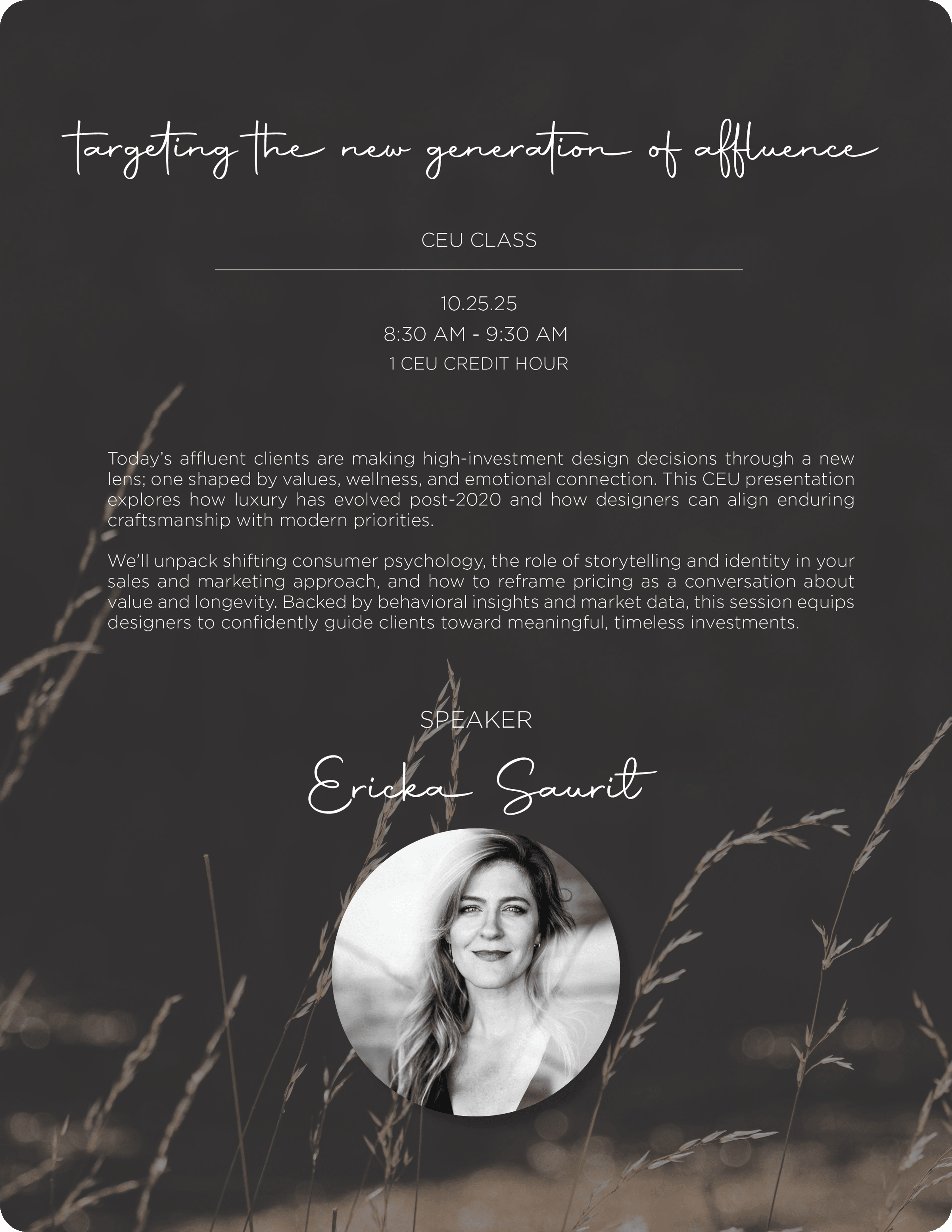 It's a chance to talk about the business of design with the people who are actively, passionately, shaping our industry in the space between all the glamour and galas. I'm always curious what's top of mind for my design clients and product brands after they leave an industry event. What's driving their growth? Challenging their revenue models? What new ideas and innovations are they learning about that don't go home in just another canvas tote, but start to take shape from the sketches and notes hurriedly scribbled during presentations, and then more deeply fleshed out in the plane or on the drive back home. I'm excited about the impact these conversations at market have on their business potential—and that's why each market I invest in guiding the conversations that shape our industry. This fall, I'll be speaking with some of the industry's brightest minds and savviest business people about their journeys, their failures, their big wins. Their ideas! I hope you'll save some time to come to attend the events that fit in with the ideas you've been considering in your own business. Stop in, say hello, and enjoy the generous hospitality of the host showrooms while you browse new introductions and all the great new designer collaborations (Cortney Bishop for Amadi Carpets, anyone!??). Here's this fall's lineup: Friday, October 24 9-5pm | Science in Design Symposium: When Design Heals (Congdon Yards) Join me for a day-long educational symposium to learn how to turn science into clear, compelling messages your clients actually understand and will say yes to. I’ll be leading a session on Marketing, Messaging, & Science for your business, alongside experts connecting biophilia, color, and neuroaesthetics to human health. If you’re ready to position your design practice as a wellness strategy—not simply a source of beauty—this day is for you. The full-day educational experience is $97 (early bird pricing has been extended). Even better, every attendee receives a $200 credit toward the Science in Design Certification Program (valued at $895), making this an exceptional investment in professional development. See the full symposium agenda and get your tickets here >> ​ Friday, October 24 3pm | American Leather Showroom (Showplace) Want better clients, higher visibility, and a design practice that lights you up? The secret isn’t doing everything (oh no no no!)...it’s doing YOUR thing 💪 I'll be moderating a panel of pros who found their focus and turned it into success that speaks volumes. Join us! ​ Saturday, October 25 8:30am | Verellen Furniture Showroom (515 S Hamilton) I never shy away from the deep research that leads to truly innovative insights, and I've been diving more and more into the mindset and psychology behind why we buy, especially within a new generation of affluence. So when my friends at Verellen asked me to create a CEU presentation for their fall event, I couldn't wait to uncover how luxury has evolved post-2020 and how designers can align enduring craftsmanship with modern priorities in their sales conversations. Seats are very limited, save yours here >> ​ Sunday, October 26 9am | American Leather Showroom (Showplace) Pretty doesn’t convert, but your story sure will! Build your brand voice in real time in this interactive workshop with two of my favorite industry darlings, and leave with copy you can't wait to can use. ​ Sunday, October 26 2pm | HPMKT's The Point (Commerce Ave between Wrenn and Main) Back by popular demand! Give clients a reason to believe with simple science to back your choices and get stronger yeses. Learn how to elevate your design decisions by using science-backed principles and come away with new vocabulary, greater confidence, and strategies that increase profit in your business. ​ ​ We’ve entered a new era of design; one where interior designers aren’t just creating beautiful spaces but building brand empires. Turn your point of view into partnerships that grow reach and revenue. RSVP here (and receive a free gift if you're one of the first 25 people to arrive!) >> ​ ​ Monday, October 27 1pm | Crystorama Showroom (IHFC) Light is mood, memory, and money. It's more than just a finishing touch, it’s a powerful driver of design impact and profitability. Learn how these two celebrated pros approach lighting design in our intimate panel discussion! ​ ____ ​ Many of these conversations are four to six (!!) months in the making...so the minute the showroom doors close at the end of October, I'll be back at work curating the conversations for the spring of 2026 with you in mind. I can't wait to see you next week in High Point, Reader! To your next big idea ✨ Ericka ​ PS...whether it's your first market or your 50th, get yourself organized with the Cool Girl’s Guide to High Point Market - Fall Edition. It's such a great go-to resource for planning your Market week in High Point ♥️ ​ |